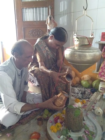 The Rishikumars of Sandipani performed laghurudrābhiṣek on Shri Chandramauleshwar Mahadev according to our scriptures early in the morning. The host of this puja was Shri Rajubhai Hathi, the son of the ex-trustee of Sandipani, Shri Tulsi bhai Hathi.