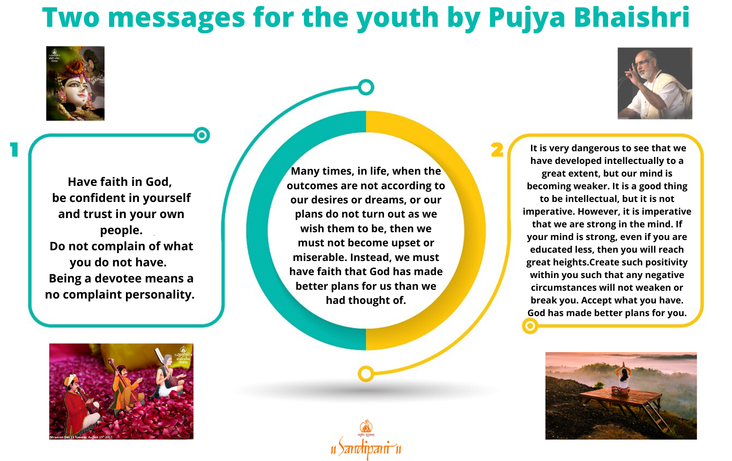 Pujya Bhaishri describes an event in his life related to how things did not turn out as per his needs and desires in life. He describes the outcome and inspires the youth with TWO MAIN MESSAGES for life.