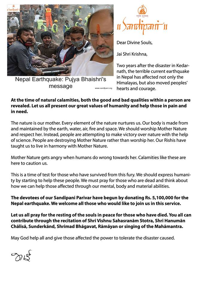 Nepal Earthquake – Pujya Bhaishri’s Message
