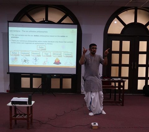 Day 3 was yet another day of learning and evolving thinking. The students learned the Durga mantra in the Vedic workshop, followed by an intensive Sanātan study class, in which they covered Śruti and Smriti literature, including ṣad darshan (six systems of philosophy), and the science of pramāna (science of knowledge) and Vedānga. In the Bhāgavat class, Shri Shyambhai Thakar discussed the story of Shri Parikshit and Kaliyuga, and the arrival of Shri Shukdevji Maharaj from Shrimad Bhagavat.
