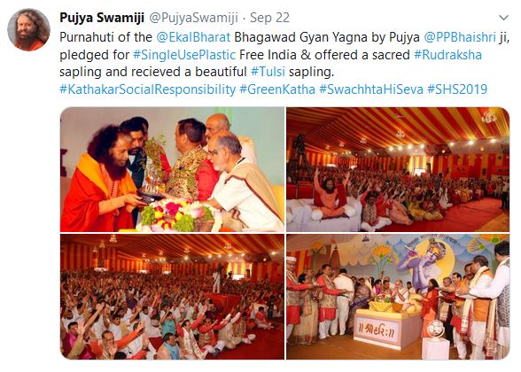 Swami Chidanand Saraswatiji Maharaj of Parmārth Niketan, Rishikesh attended the conclusion of this grand Katha. Pujya Swamiji tweeted as follows: